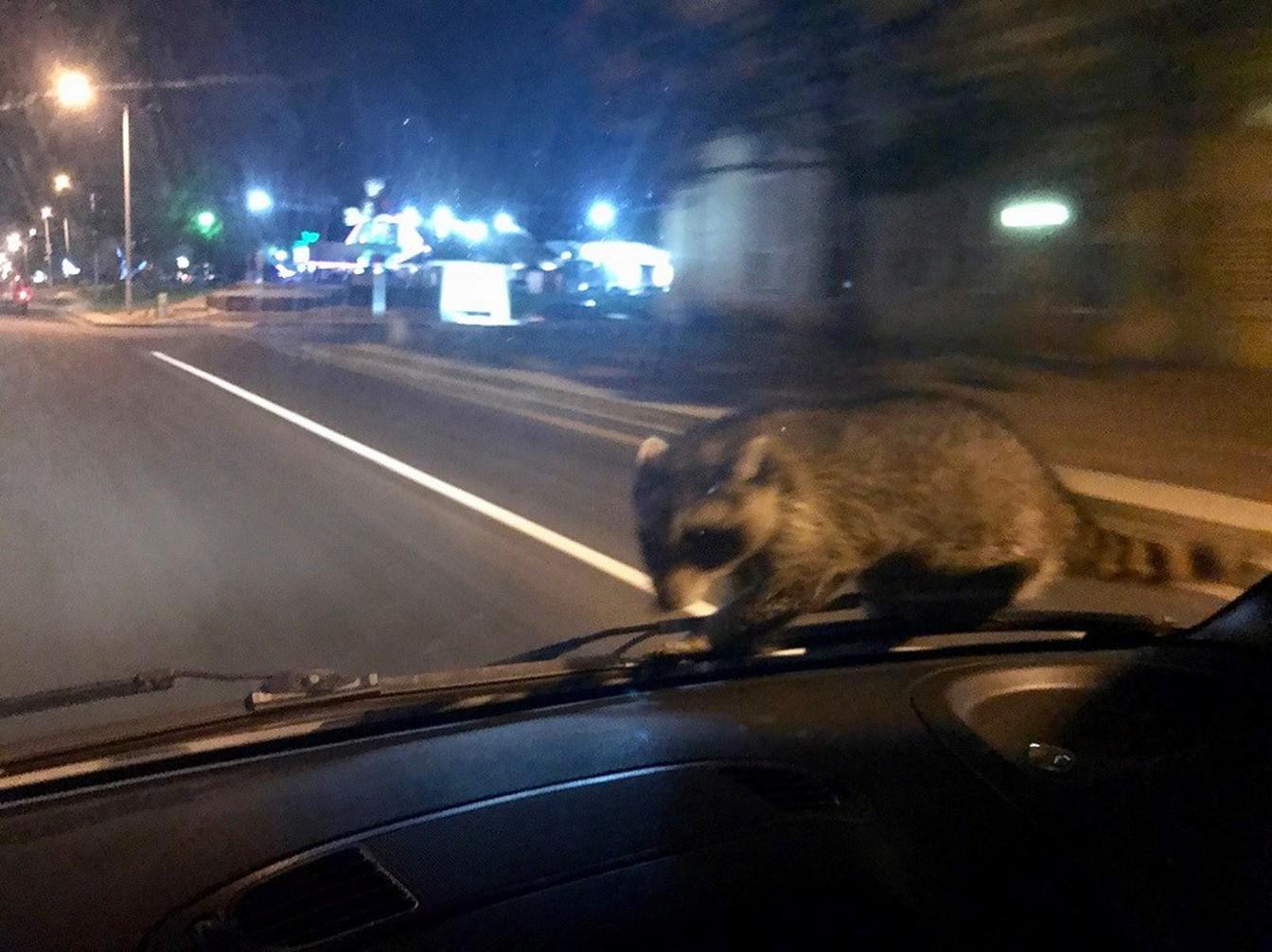 Guaxinim pega carona no para-brisas do carro da polícia.